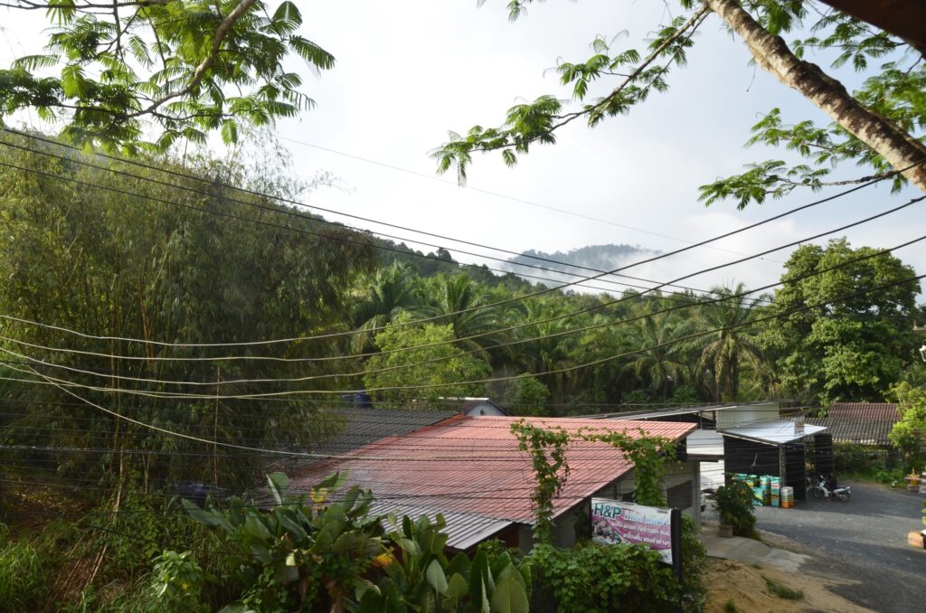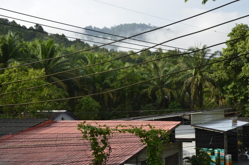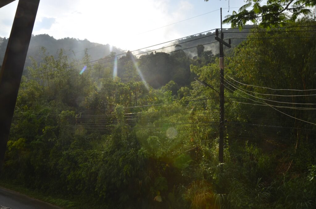 Während des Weges von der Haltestelle zum Hostel regnet es das erste Mal seit dem ich in Thailand bin. Im Hostel angekommen fängt es an richtig zu schütten und zu Gewittern. Als ich am Balkong stehe und mit einer Engländerin quatsche schlägt Luftlinie etwa 50-100 Meter entfernt ein Blitz In das Dickicht ein. Zusammen mit dem Blitz erfolgt ein massiver Donner. Rauch ist dort wo der Blitz eingeschlagen hat zu sehen. Wir haben uns total erschrocken😄 Nach dem Gewitter steigt Nebel aus dem Wald auf und ergibt zusammen mit der hinter dem Berg stehenden Sonne eine Mystische Kulisse.